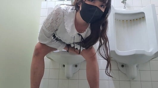 【男子トイレ放尿】ゴスロリぽい服装の黒髪女子がお尻を突き出し立ちション。勇気ある挑戦!w